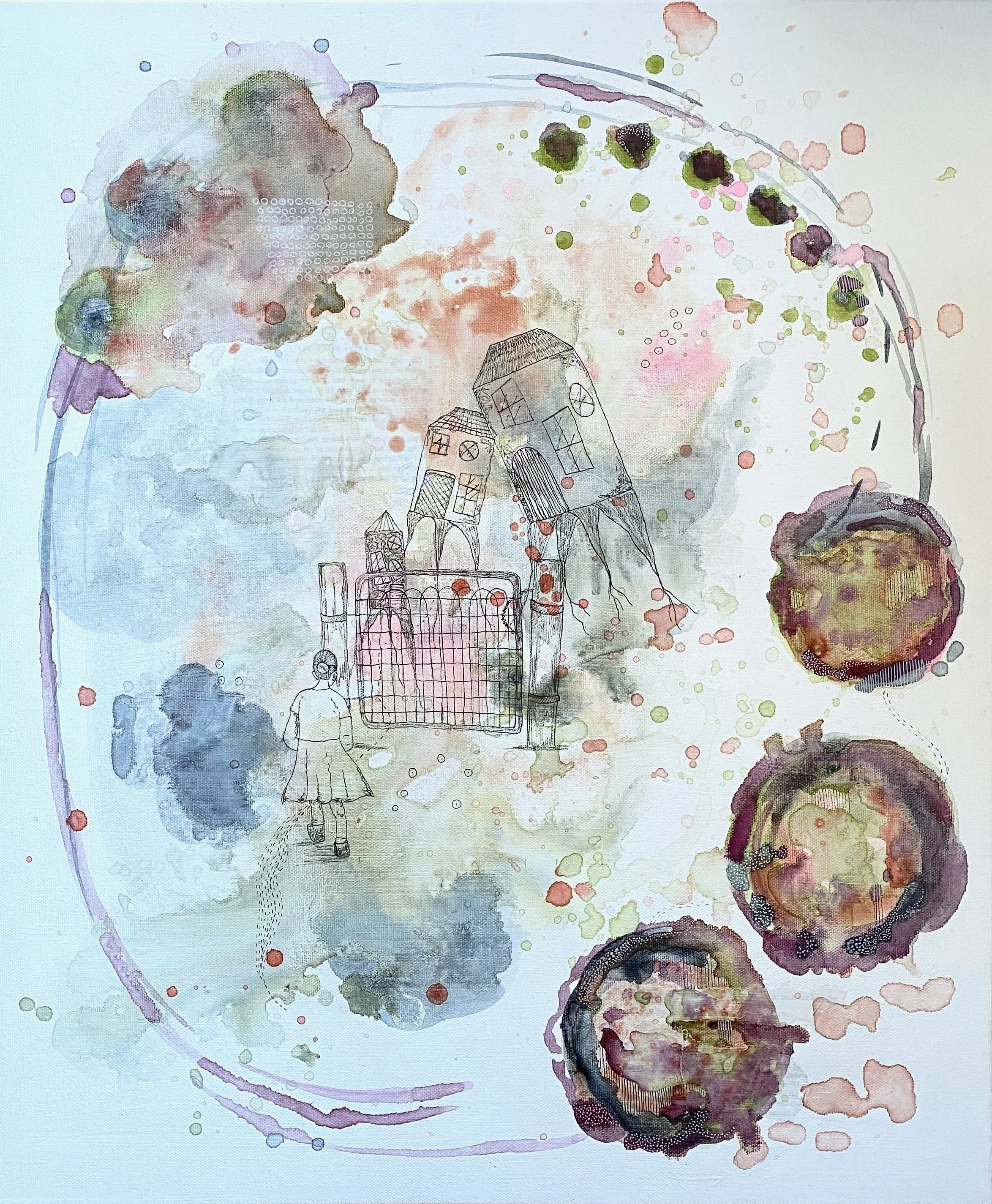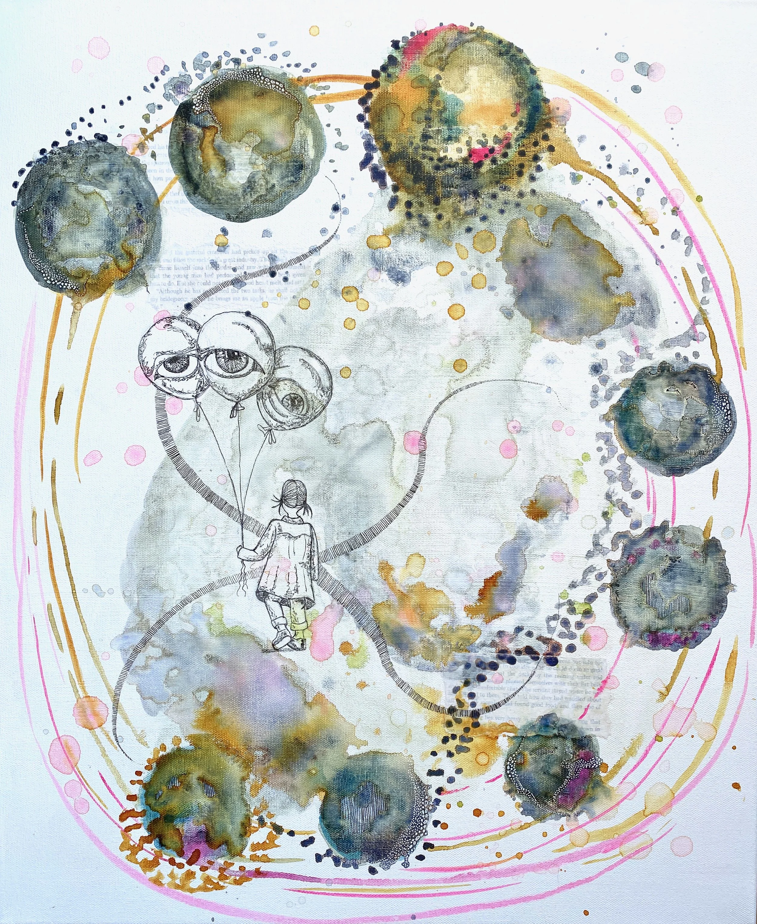 Witness My Descent: 2025, 16" x 20", Watercolors, Fairy Tale book pages, and ink on canvas
